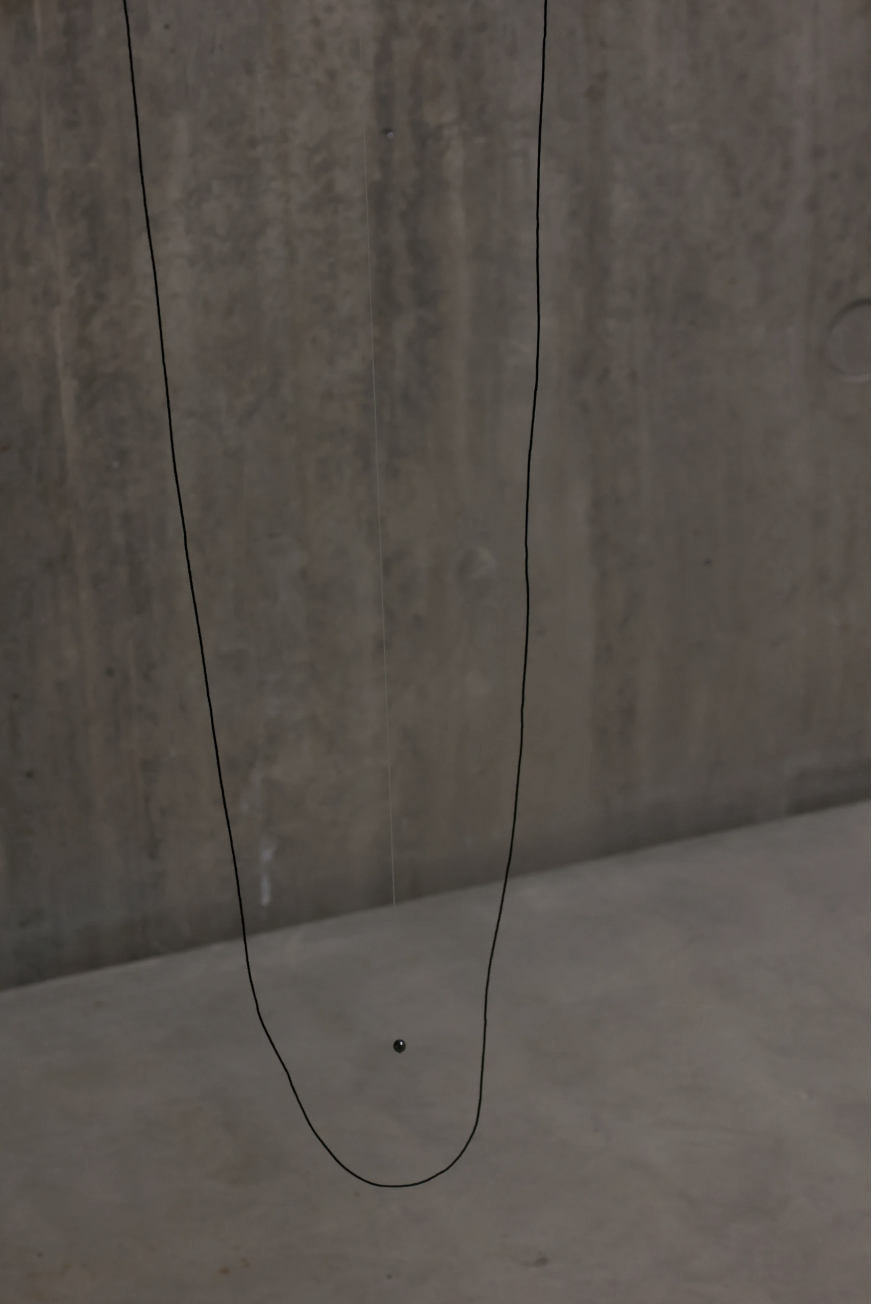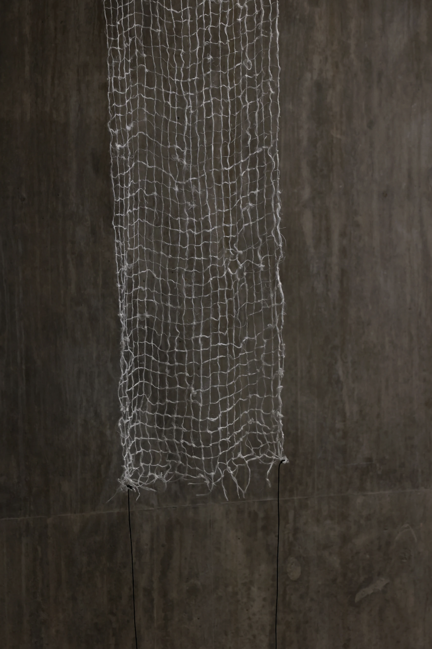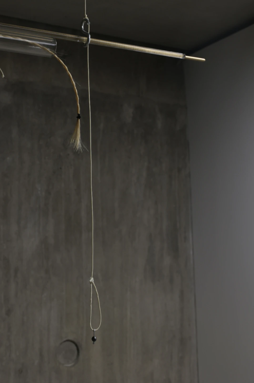 ‘A Veil, A Lock Of Hair’, 2022. Sculpture. Glass, hand spun and woven nettle fibre, brass, horse hair, hematite, waxed cotton thread